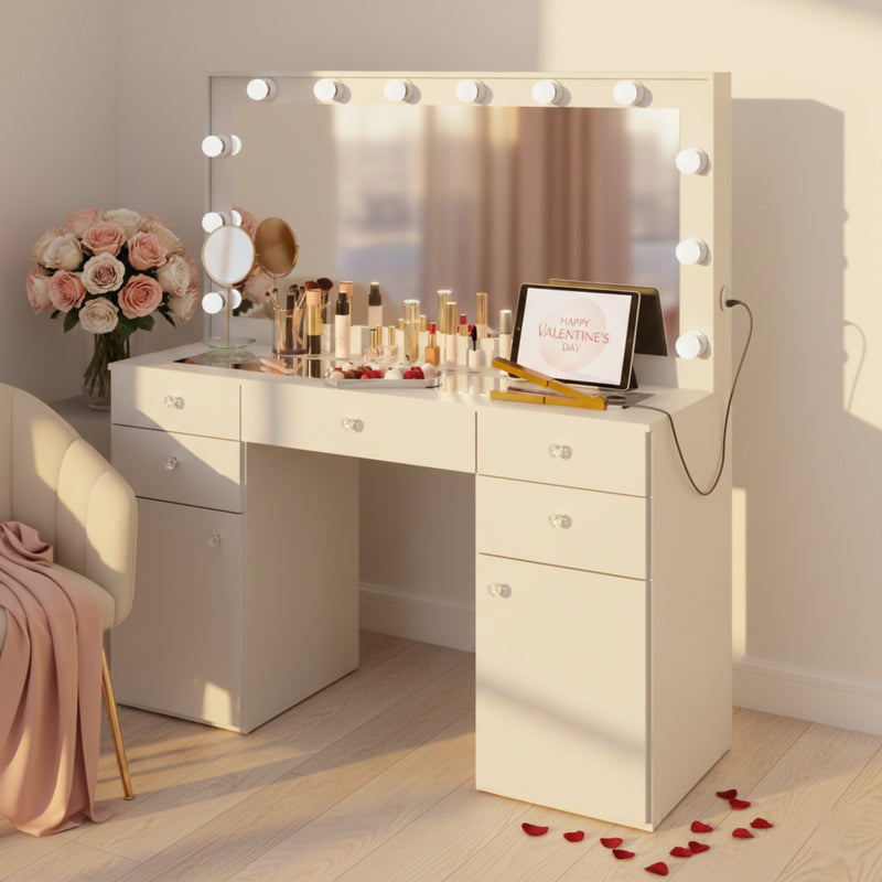 - 5 Drawers + 2 Bottom Cabinets: Smart storage keeps palettes, brushes, hair tools, and skincare organized—featuring a large center drawer for quick access.