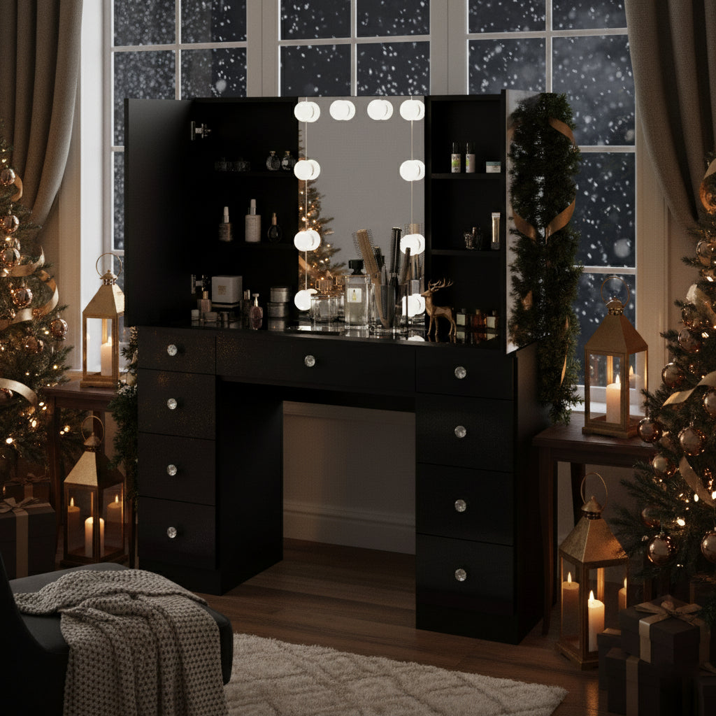 Tri-fold mirror with hidden storage • Optional Hollywood Light Bulbs • Glass top • 9 drawers with jewelry organizer