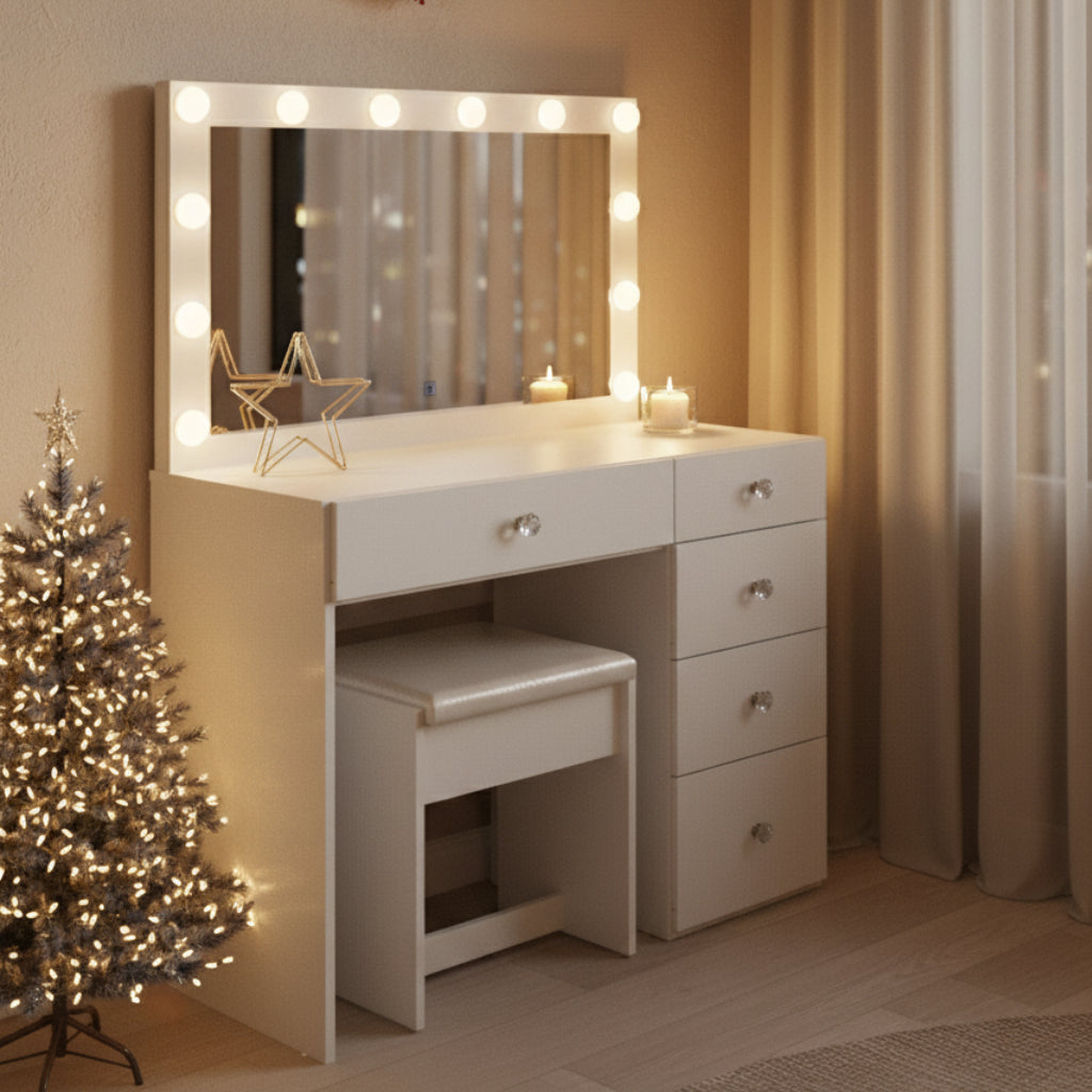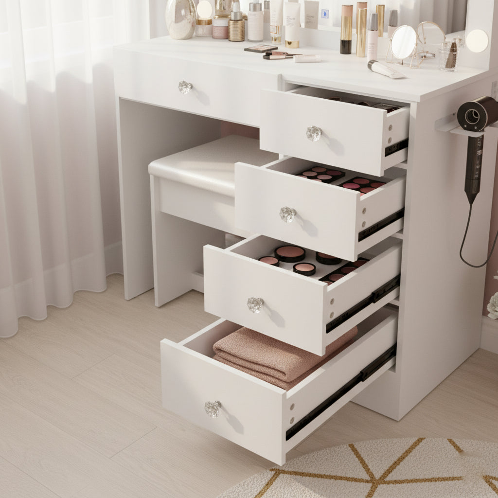- Five Spacious Drawers: Keep makeup, brushes, and accessories neatly organized and within reach.
