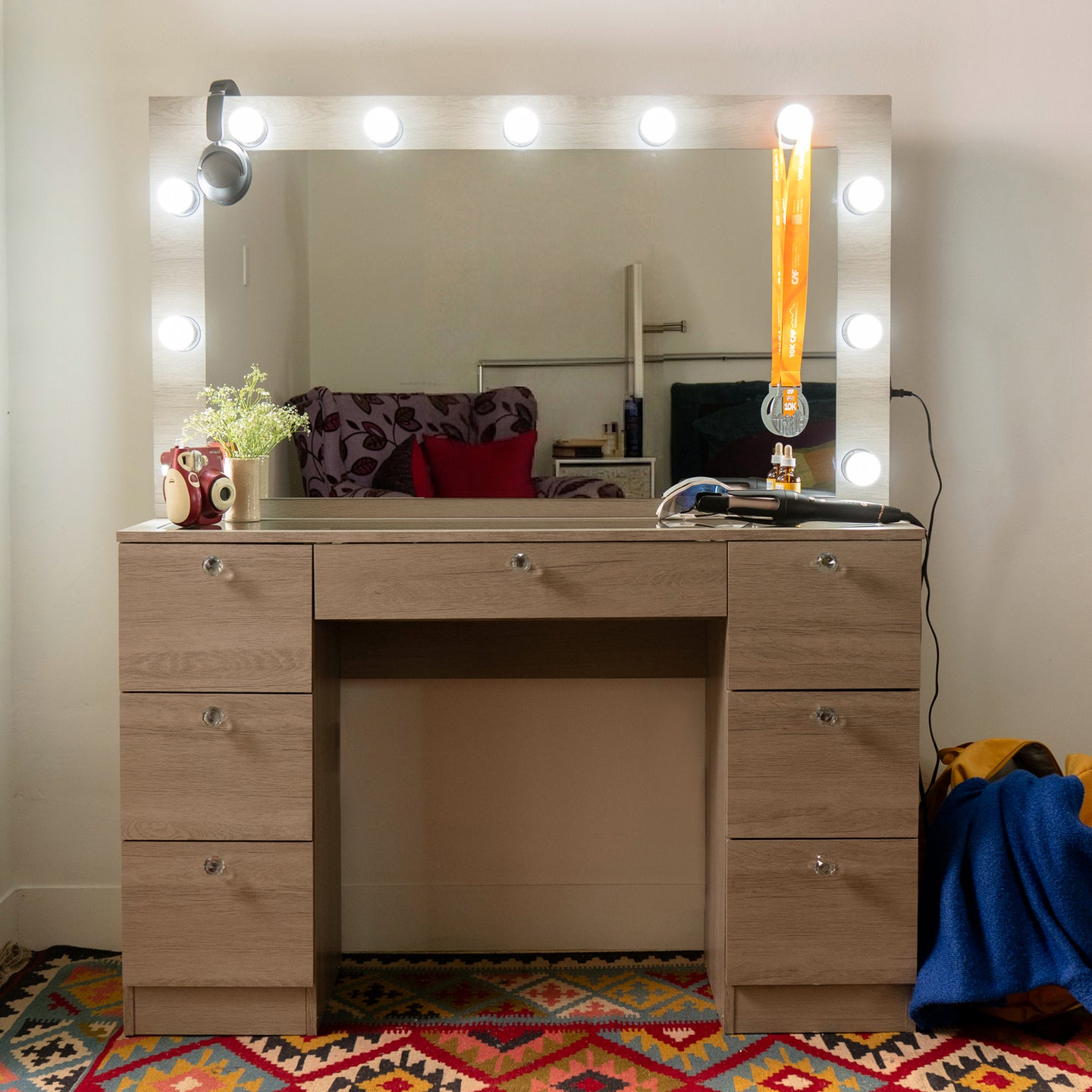 Nova features a wide mirror framed with dimmable bulbs designed to provide bright, even illumination for makeup application, skincare, and hairstyling. This setup helps create a more comfortable and visually clear experience throughout the day.