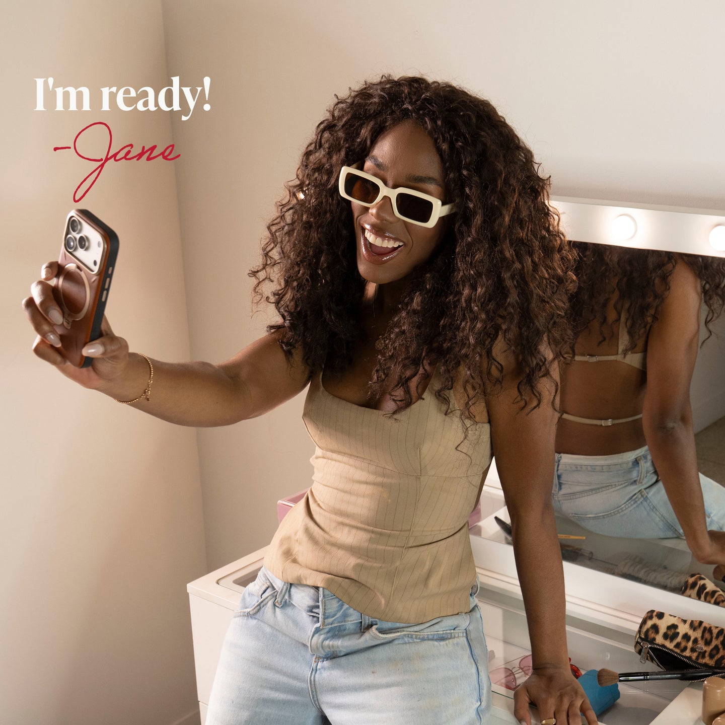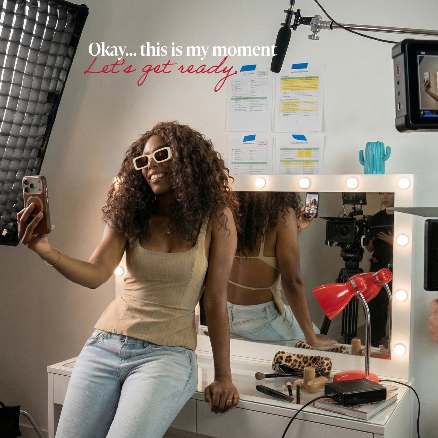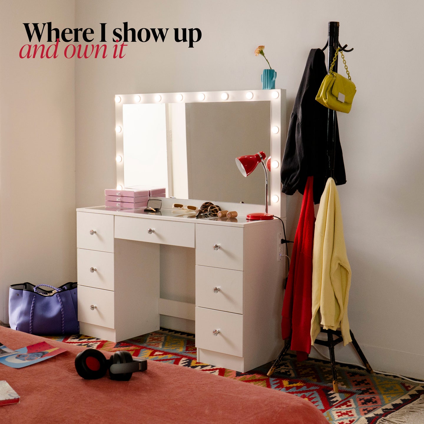 Its wide framed mirror with dimmable bulbs helps create a bright and consistent setup for makeup, skincare, hairstyling, and content-ready routines. Below, Nova offers a balanced drawer configuration that keeps beauty products, accessories, and tools organized, while the tempered glass top adds protection and a more elevated finish to the vanity surface.