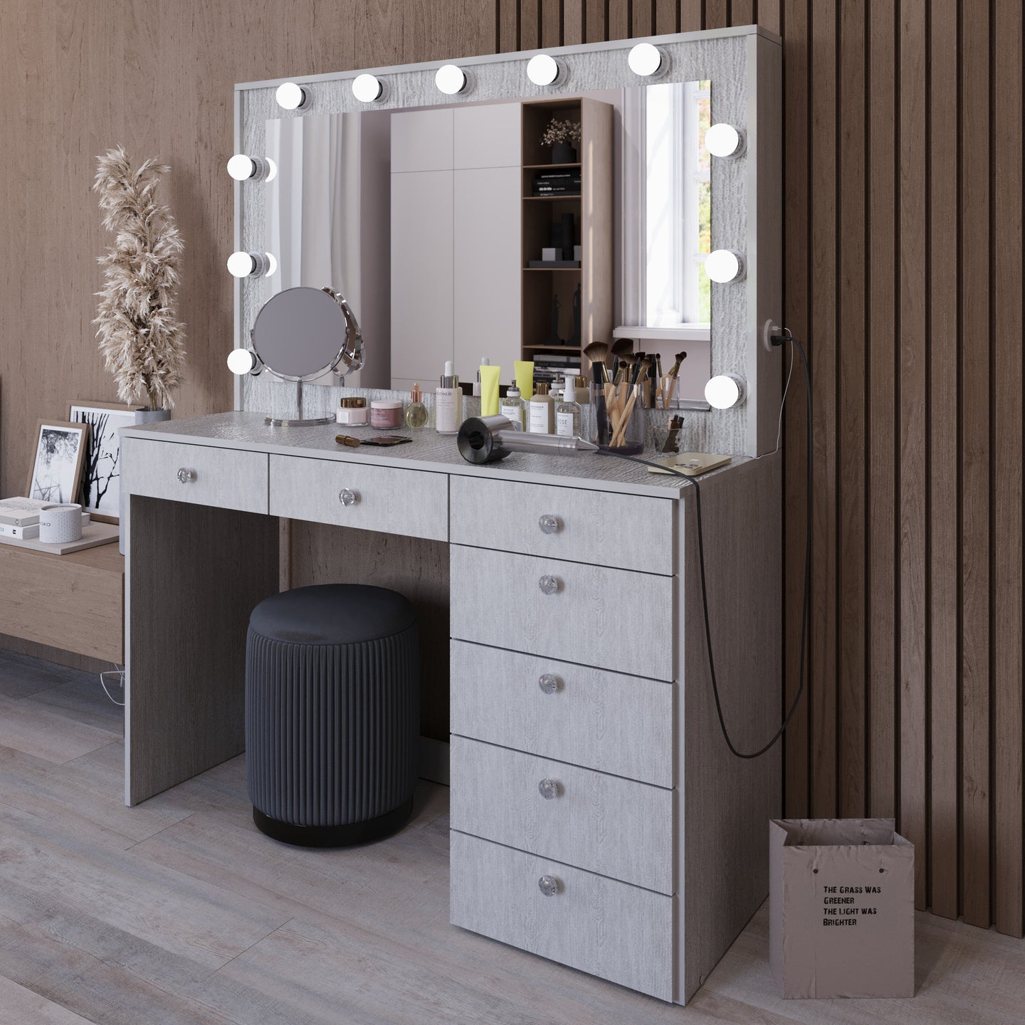 Surrounding the wide mirror, the built-in lights provide professional-grade illumination, ensuring consistent and flattering lighting for precise makeup application every time.