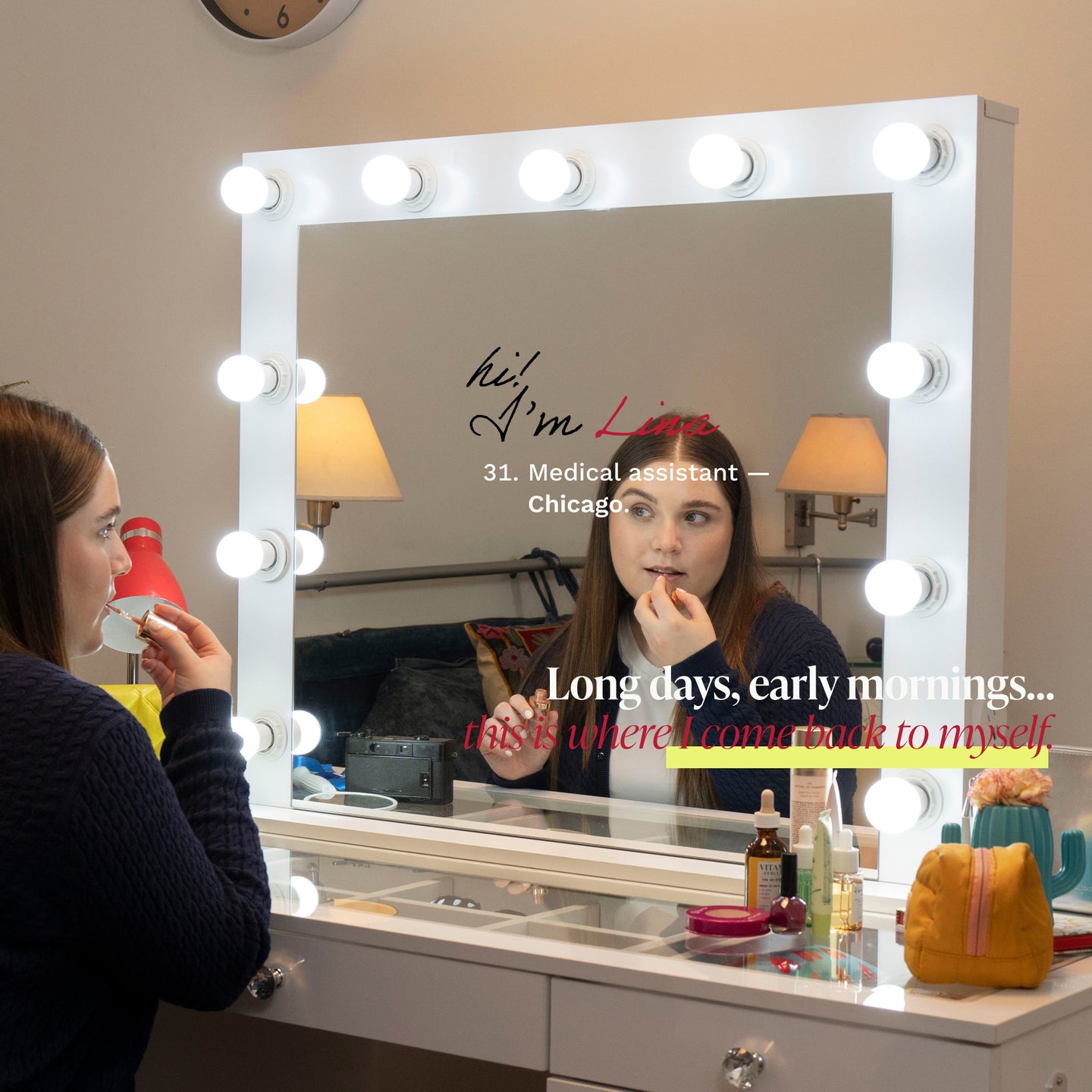- Zoey Pro Only: Framed bulb mirror with 11 bulbs and power outlet.
