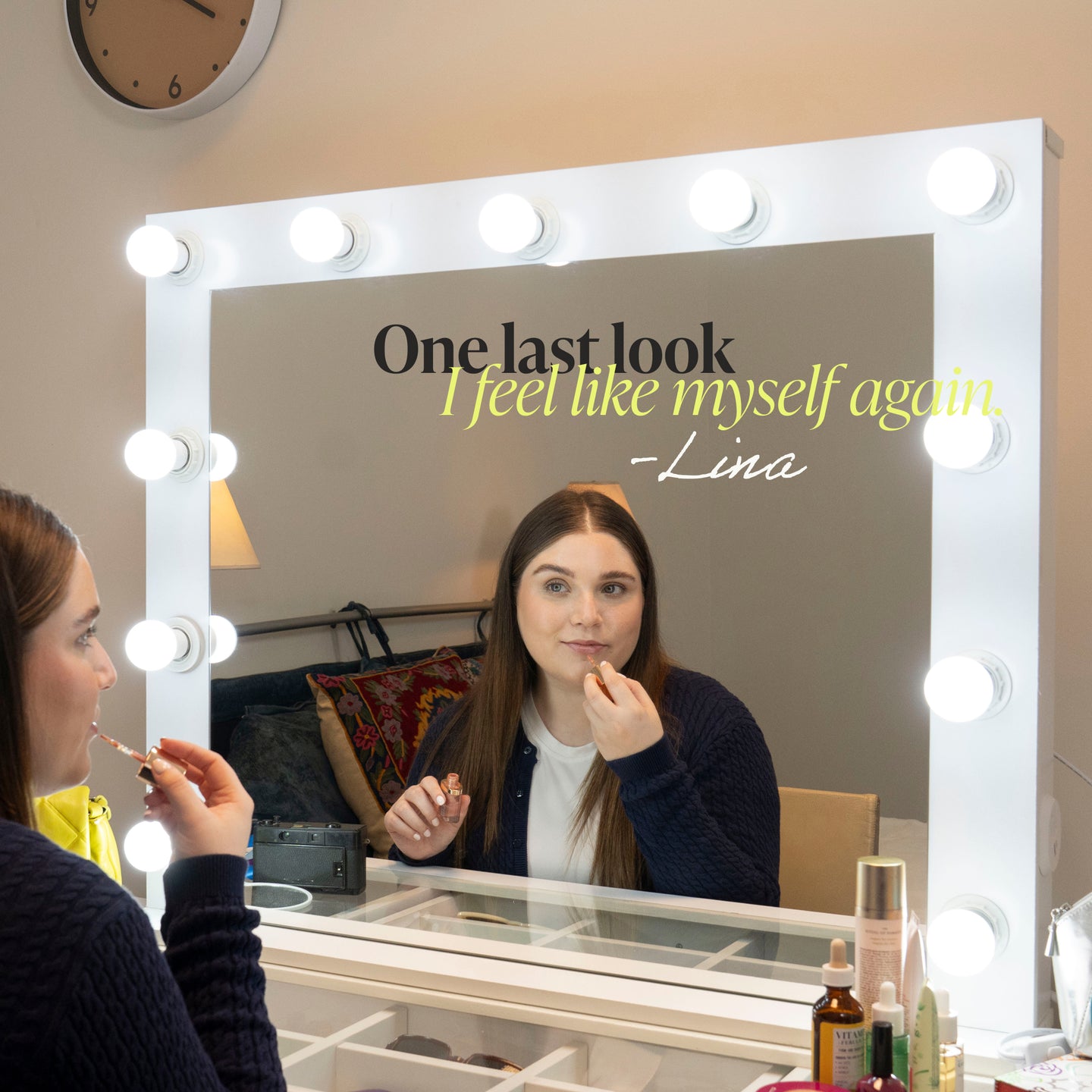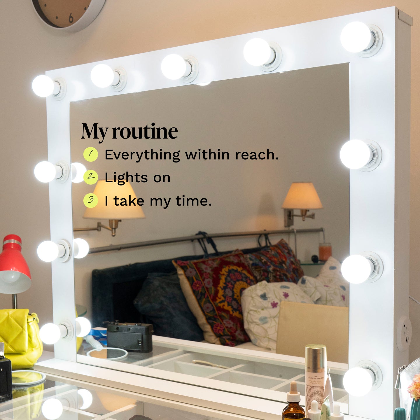 The Zoey Pro includes a removable framed mirror with 11 bulbs that provides consistent and even illumination for detailed makeup application. This feature is exclusive to the Pro variation.