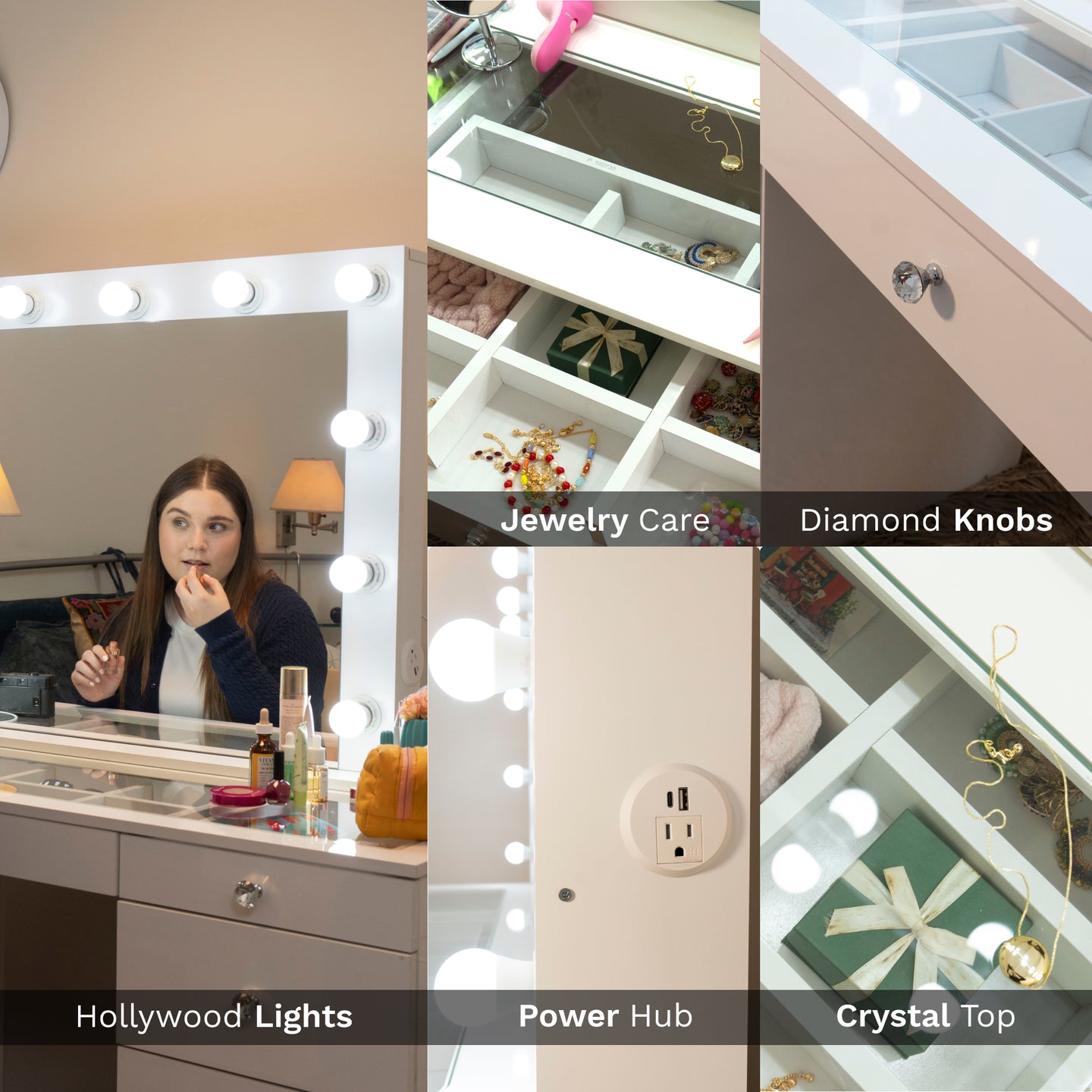 Zoey is available in two variations: Zoey Plus and Zoey Pro. Both share the same spacious structure, elegant crystal knobs, jewelry divider, and integrated hair dryer holder. Zoey Pro includes a framed bulb mirror and a power outlet, while Zoey Plus offers the same extra-large vanity station without those add-on features.